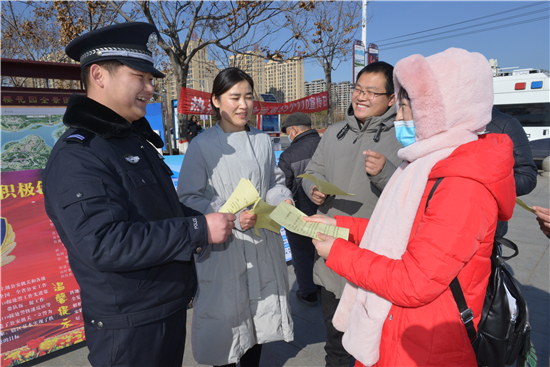 為迎接第35個“110宣傳日”的到來,1月9日,扶溝縣公安局組織民警在人民公園廣場開展“一心為民110,砥礪奮進(jìn)新征程”為主題宣傳活動。民警通過現(xiàn)場發(fā)放宣傳資料、法律宣傳、警民互動等方式介紹110社會聯(lián)動常識,教群眾如何提升冬季安全防范知識,進(jìn)一步密切警民關(guān)系。圖為民警向過往群眾發(fā)放宣傳資料。