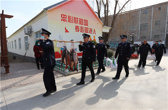 隨著春節(jié)日益臨近,該派出所所長(zhǎng)楊杰和大家商議,“送溫暖送祝福”活動(dòng),應(yīng)該先從尊老愛幼開始。于是,民警們購(gòu)買了60斤魚、100斤雞蛋和2袋面粉,利用中午休息時(shí)間來(lái)到敬老院,給老人們送上新春祝福。