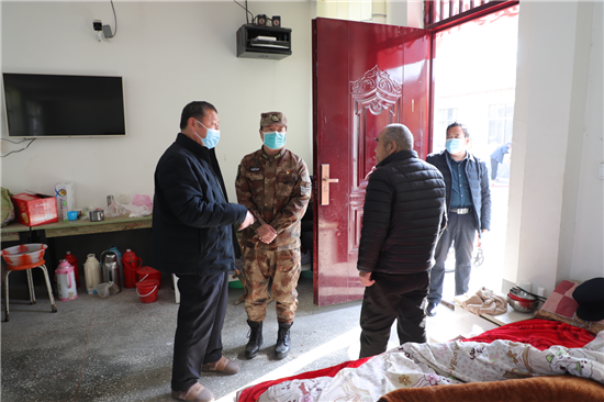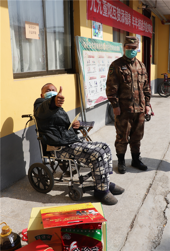 新橋鎮(zhèn)新兵楊凱入伍前和癱瘓的父親相依為命,市人武部領導協(xié)調地方政府,把其父親送到了新橋鎮(zhèn)敬老院公費養(yǎng)老,解除他的后顧之憂。春節(jié)到了,人武部領導還牽掛著這個特困家庭,矯百成帶隊來到新橋鎮(zhèn)敬老院。此時正值中午,楊凱的父親正坐在屋外的輪椅上曬太陽,見到矯部長的突然到來,激動的眼含熱淚,他緊緊握住矯百成的手久久不愿松開。矯百成噓寒問暖,給他送上1000元慰問金和生活必需品,楊凱的父親用他那不太清晰的語言表達對部長的真誠感謝。在敬老院院長的帶領下,矯百成又來到老人的住室察看起居情況,詢問他平時生活狀況,當?shù)弥先松畹暮苁娣r,矯百成滿意的笑了。