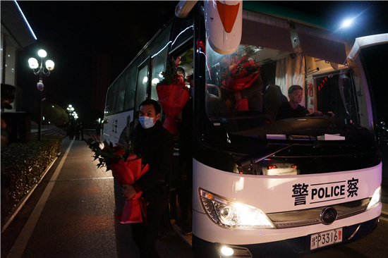 英雄凱旋,鮮花致敬。2月6日夜晚11時(shí)許,寧洛高速項(xiàng)城北收費(fèi)站警燈閃爍、隊(duì)列整齊,項(xiàng)城市公安局在這里隆重舉行儀式,熱烈歡迎 “1.8”專案組民警勝利歸來。副市長(zhǎng)、公安局長(zhǎng)萬東偉,局黨委副書記、副局長(zhǎng)陳重,局黨委委員、政辦室主任衛(wèi)偉,局黨委委員袁啟峰等領(lǐng)導(dǎo)出席儀式,部分民警代表參加了儀式。萬東偉同志代表局黨委對(duì)此案的成功偵破表示熱烈祝賀,真誠感謝專案組民警的辛勤付出,并向大家致以崇高的敬意。
