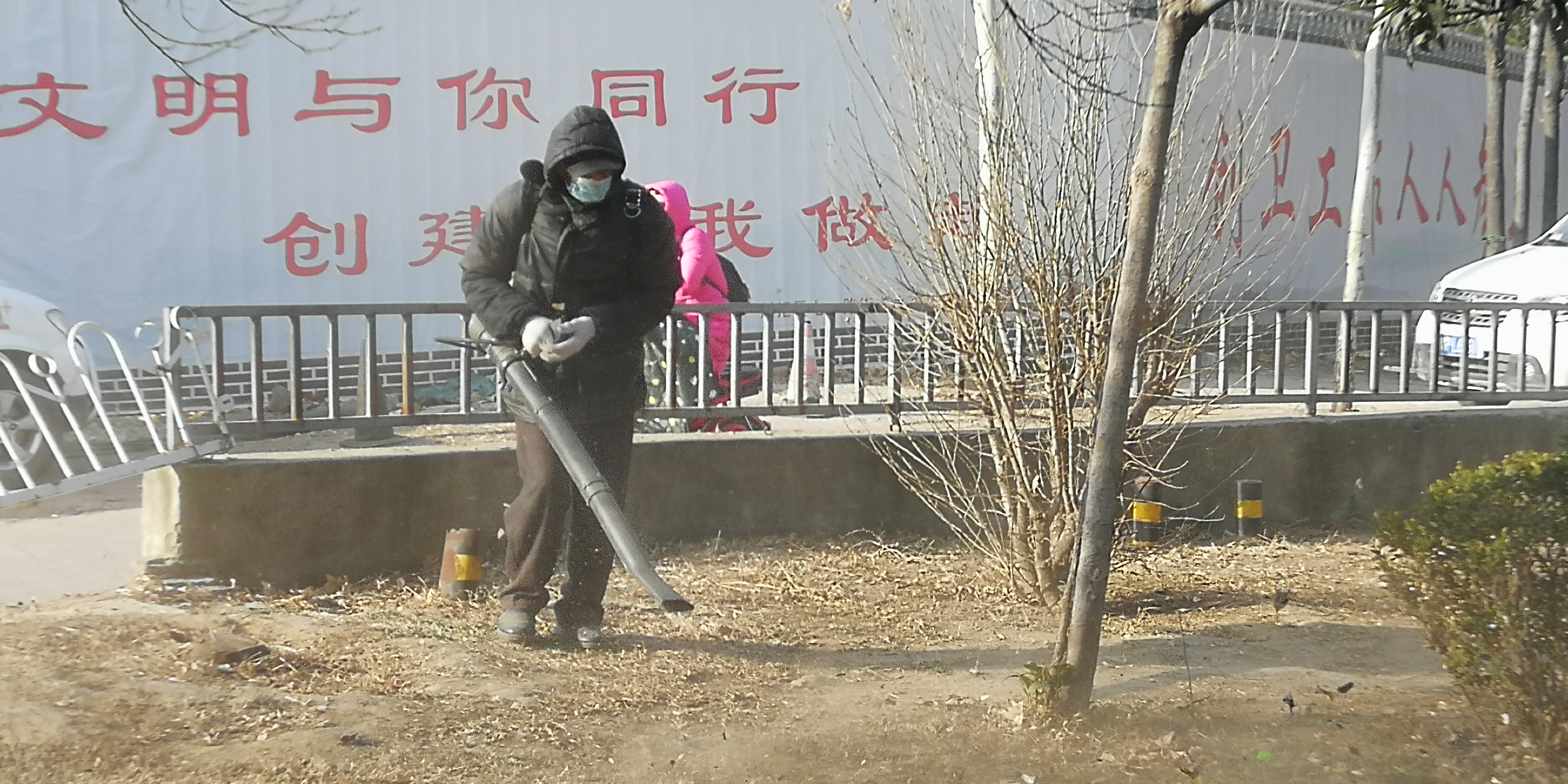 2月11日,大年三十。在川匯區(qū)濱河路上,工作人員背著吹風(fēng)機(jī)清理游園內(nèi)的落葉和垃圾。工作人員介紹,這樣便于更快更好地工作。(周口日?qǐng)?bào)·周道客戶端記者 馬月紅)②7