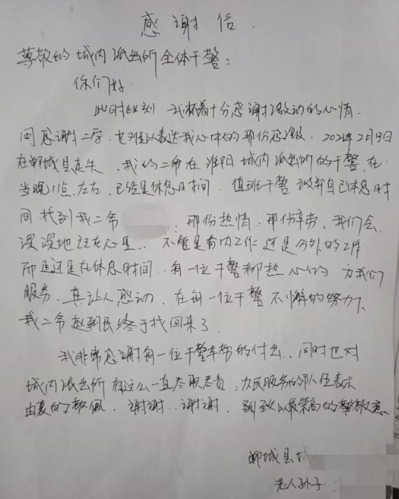 家屬告訴民警,老人去年剛做完手術(shù),身體存在一點(diǎn)問題。民警告知老人家屬今后要看管好老人,謹(jǐn)防走失,并為老人建立易走失人員檔案,以備兄弟單位使用,老人家屬對(duì)城內(nèi)派出所表示感謝并寫了一封感謝信。