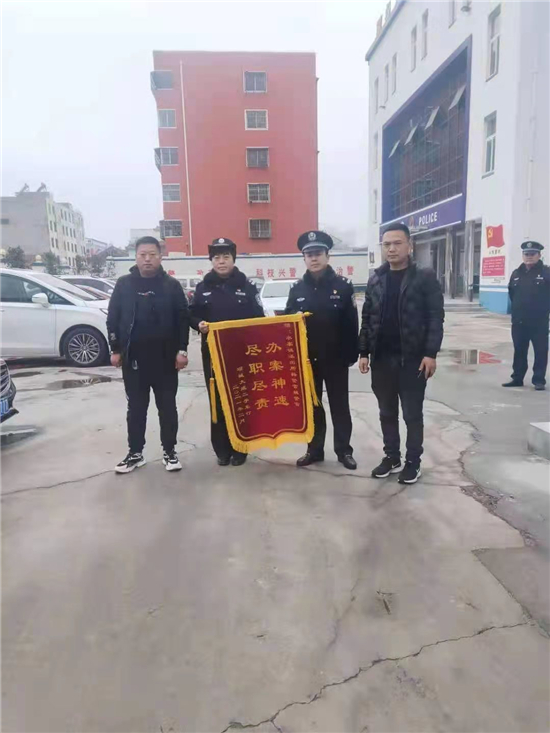 2月25日上午,項城市公安局水寨派出所門口鑼鼓齊鳴,異常熱鬧,兩名男子手持一面寫有“辦案神速、盡職盡責(zé)”字樣的錦旗,送給派出所民警,深表謝意。