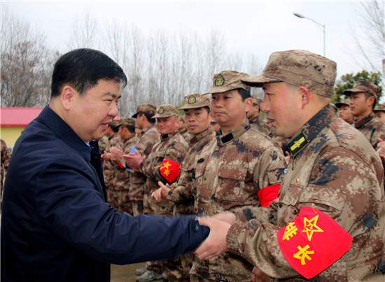 3月1日上午,河南省鹿邑縣在民兵訓練基地召開2021年上半年預定新兵役前教育訓練動員大會,縣委書記、縣人武部黨委第一書記李剛,縣委常委、副縣長王曉征,縣人武部部長范亞光、 政委李峰、副部長時祖奎,以及全體預定新兵和教練員骨干共240人出席會議。會議由縣人武部政委李峰主持。