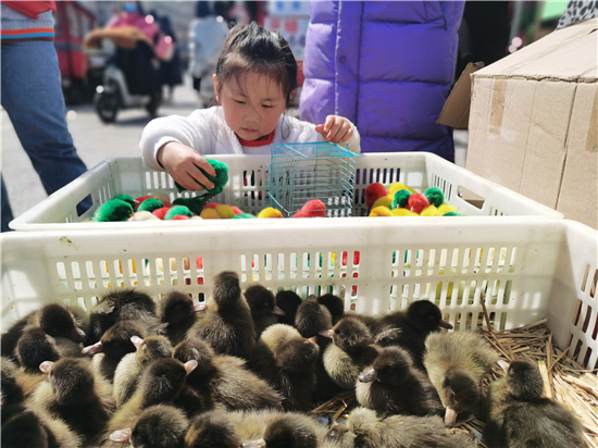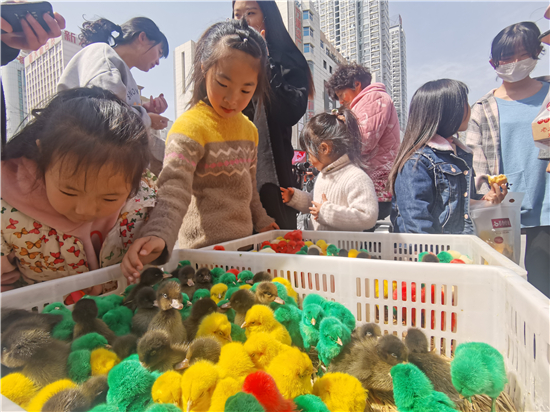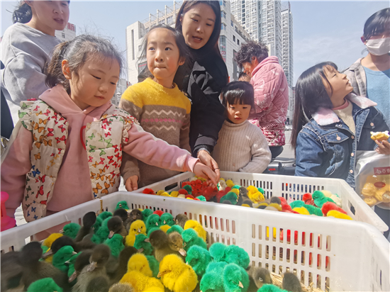 3月21日,在城區(qū)五一路口,幾個(gè)售賣(mài)小雞小鴨的攤位前吸引了不少市民。所售賣(mài)的小雞小鴨被染上了紅色、黃色、綠色等色彩艷麗的顏色,憨態(tài)可掬的小雞小鴨尤其受到了孩子們的喜愛(ài),不時(shí)有過(guò)往行人駐足詢(xún)問(wèn)價(jià)格。