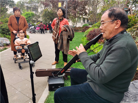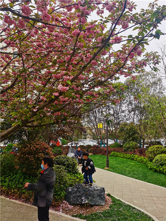 4月12日,中心城區(qū)文明路與七一路交叉口的街頭游園內(nèi),櫻花盛開,綠坪如茵,老人們?cè)谧詩(shī)首詷罚苁切腋芤狻?/p>