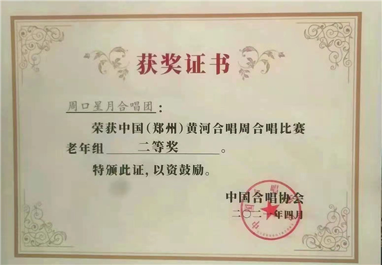 4月24日至27日,在河南鄭州舉辦的首屆“中國(鄭州)黃河合唱周”全國大賽中,周口星月合唱團獲老年組二等獎。這次由中國合唱協(xié)會牽頭舉辦的合唱大賽,全國共有72支隊伍參賽,劉楠、石孟嘵分別擔任合唱團指揮和鋼琴伴奏。