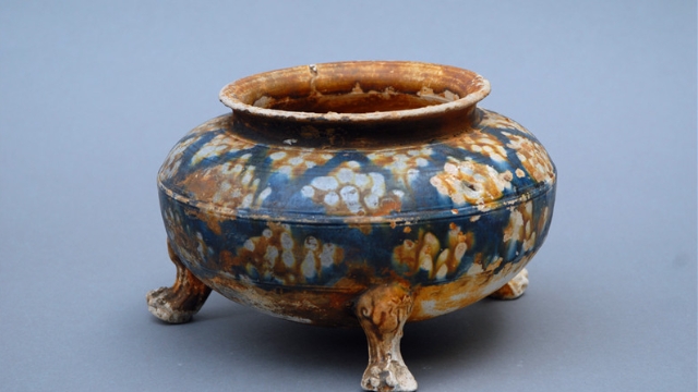 • 周口市博物館陳列著一件唐代藍釉三彩爐,它整體施藍釉,白黃交錯,挺著圓圓的肚子在唐三彩隊伍里高冷“上線”、“C位”出道。