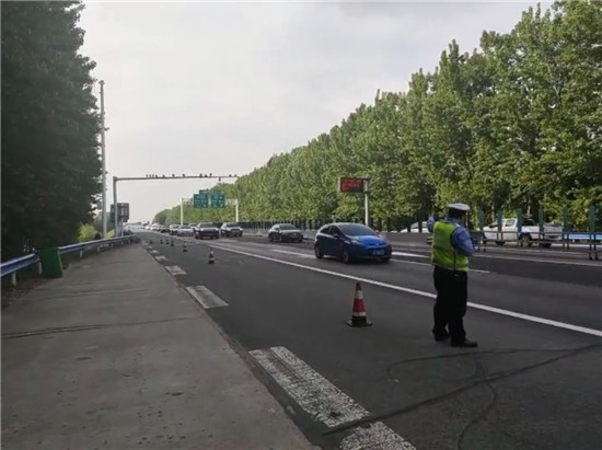 圖片說明:交警在大廣高速與商南高速互通立交南2062公里附近指揮交通