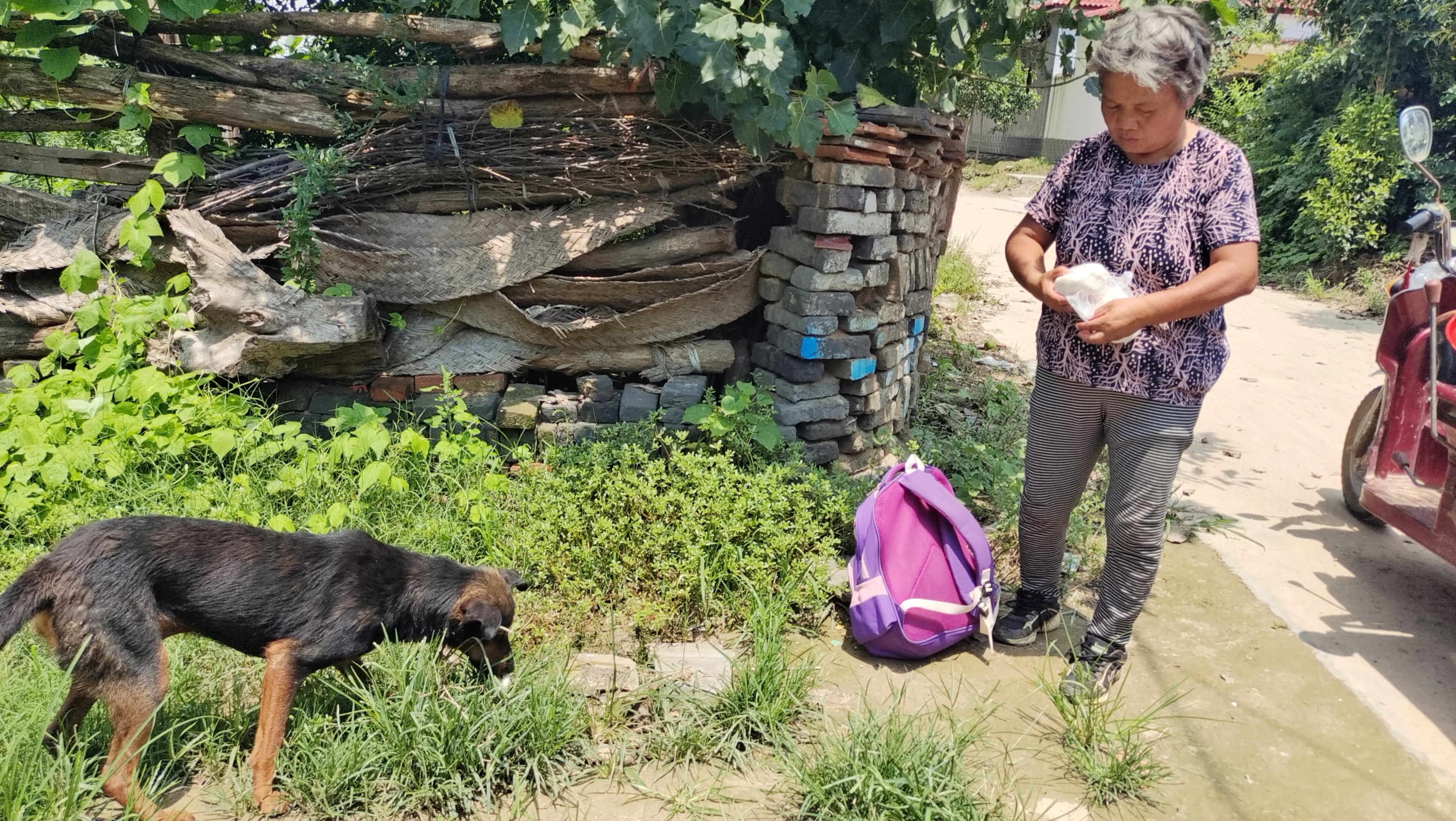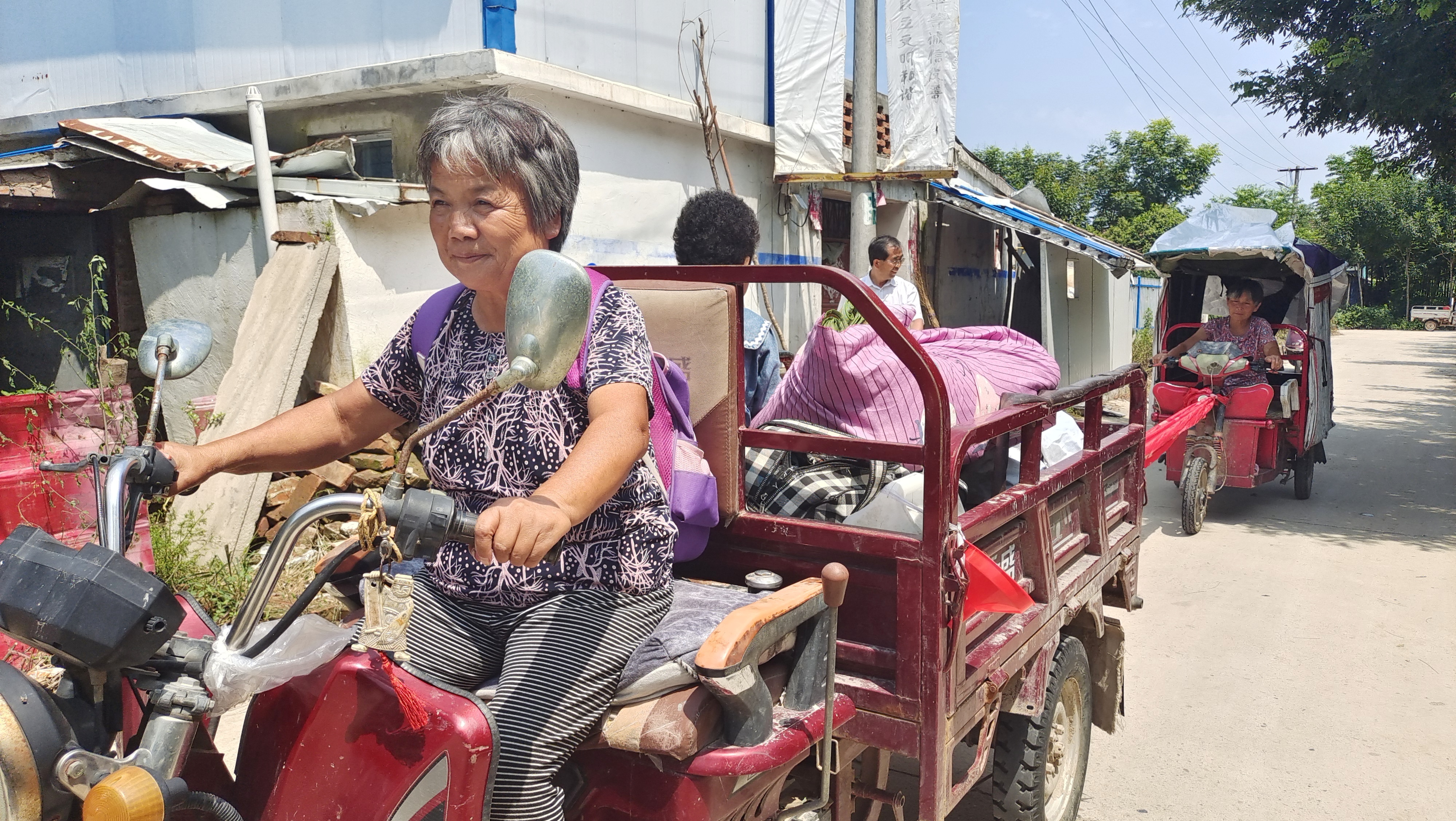 駛出不到幾百米,張梅碰到鄰居王妞的電動(dòng)三輪車(chē)沒(méi)電了,這可讓王妞急出一把汗。她們一商量,就在車(chē)上找了一段舊條幅,由張梅的機(jī)動(dòng)三輪車(chē)牽著王妞的電動(dòng)三輪車(chē)?yán)^續(xù)趕路。