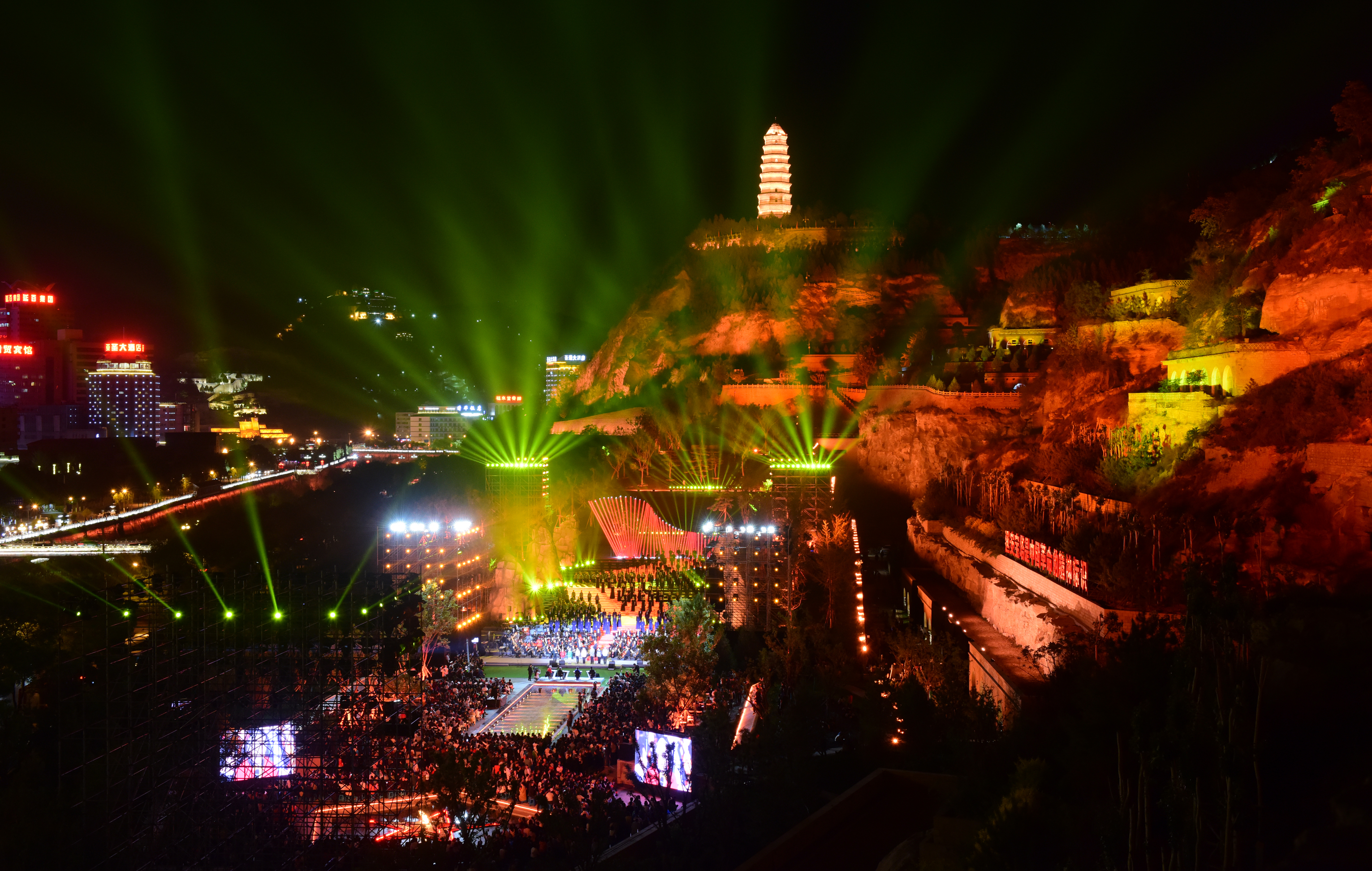 夜幕降臨,延安的寶塔山上,一場(chǎng)融實(shí)景、音樂(lè)和燈光為一體的燈光秀“講述”著延安的紅色歷史。延水河畔,一批批游客前來(lái)“打卡”。