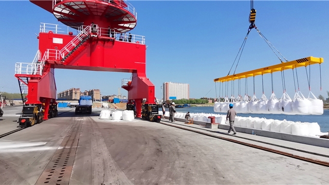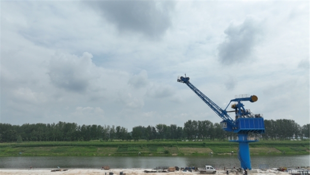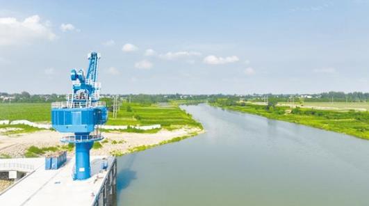 • 盛夏七月,在項(xiàng)城市東部的項(xiàng)城港,幾架“高聳入云”的新式固定式起重機(jī)的主體已安裝完畢,剩余的部件堆放在地上,巨大的框架和鮮紅的涂裝展示著它們的力量。一側(cè),千噸級貨輪正??吭陂L長的泊位前,起重機(jī)緩緩卸下貨艙內(nèi)的散貨。