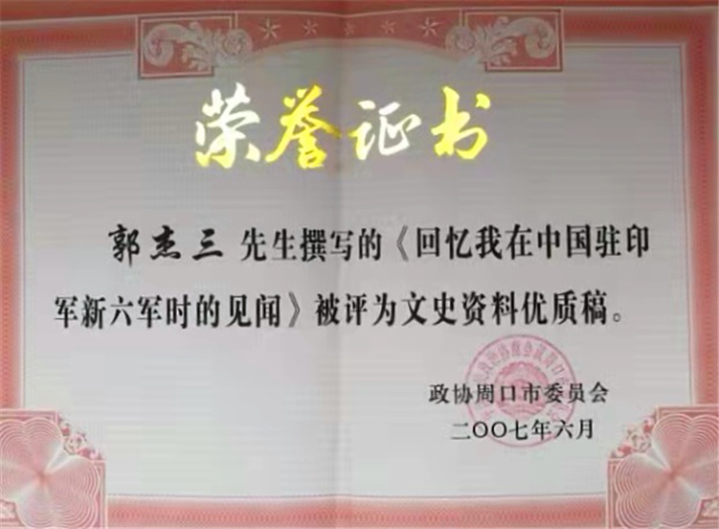 2005年9月3日,時(shí)任中共中央總書記、國家主席、中央軍委主席胡錦濤發(fā)表了《在紀(jì)念中國人民抗日戰(zhàn)爭暨世界反法西斯戰(zhàn)爭勝利60周年大會(huì)上的講話》,正視了正面戰(zhàn)場國民黨軍隊(duì)抗戰(zhàn)的歷史。之后,父親才給我講述他遠(yuǎn)征抗日的經(jīng)歷,并撰寫了《回憶我在中國駐印軍新六軍時(shí)的見聞》一稿,刊登在2007年《周口文史資料》上。政協(xié)為表彰父親的貢獻(xiàn),特別頒發(fā)了“文史資料優(yōu)質(zhì)稿”獎(jiǎng)狀。