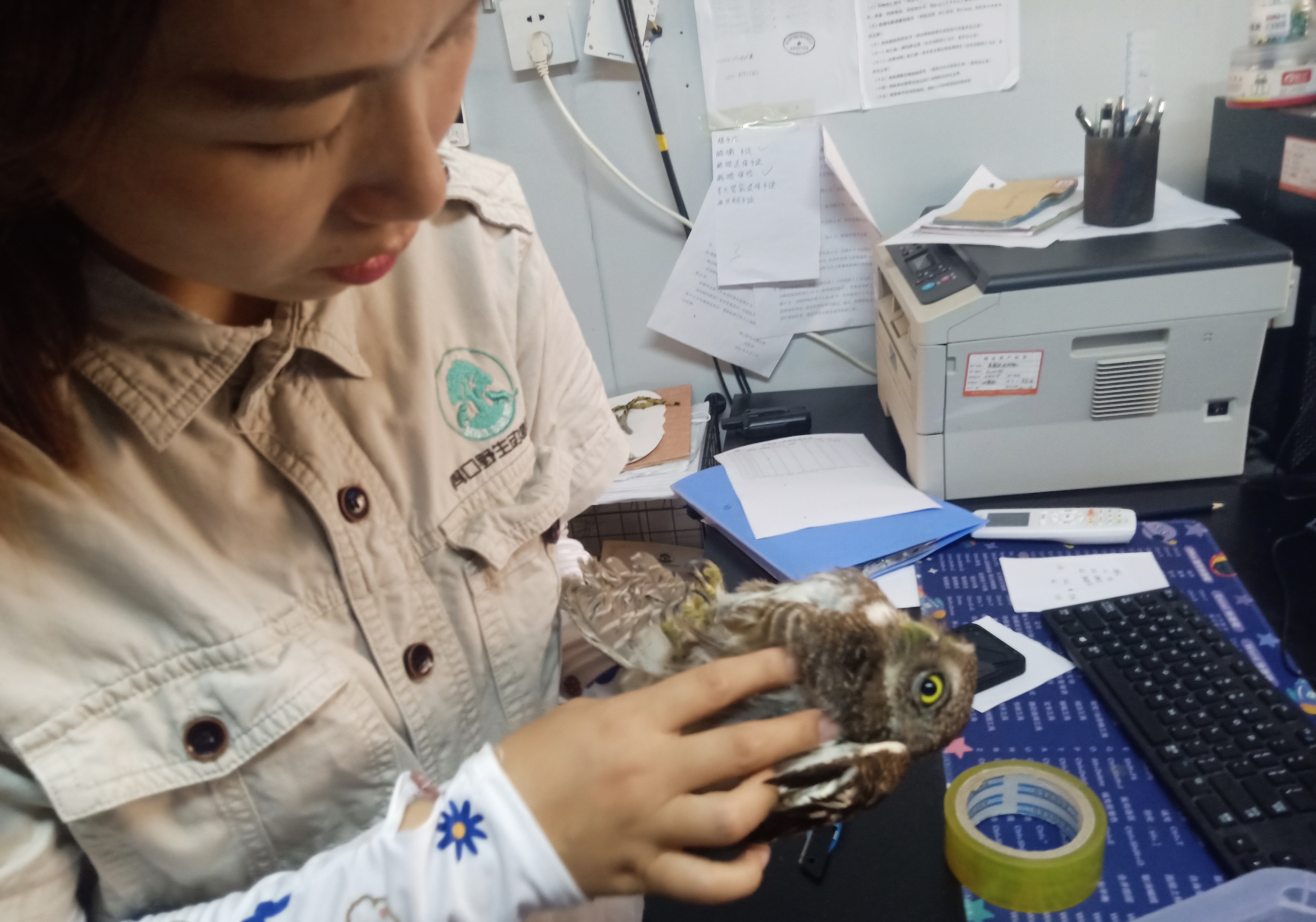 周口市野生動(dòng)物救護(hù)中心專業(yè)人員楊露露對(duì)這只斑頭鵂鹠進(jìn)行檢查傷情后說(shuō):“這只斑頭鵂鹠內(nèi)傷嚴(yán)重,需要治療一段時(shí)間才能放歸大自然?!?/p>