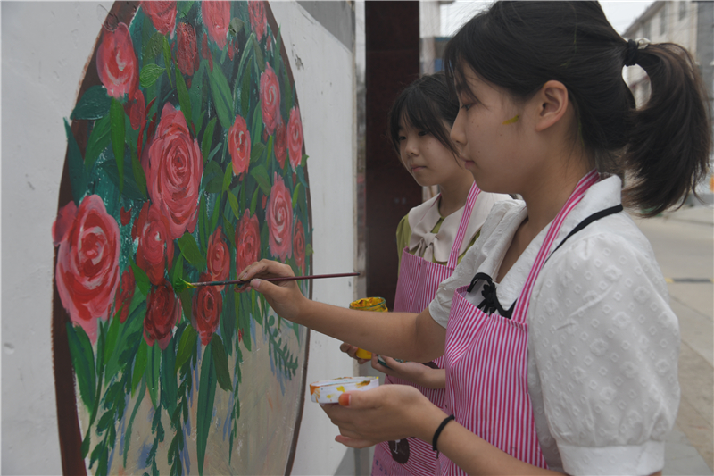 小姐妹手繪壁畫扮靚美麗鄉(xiāng)村