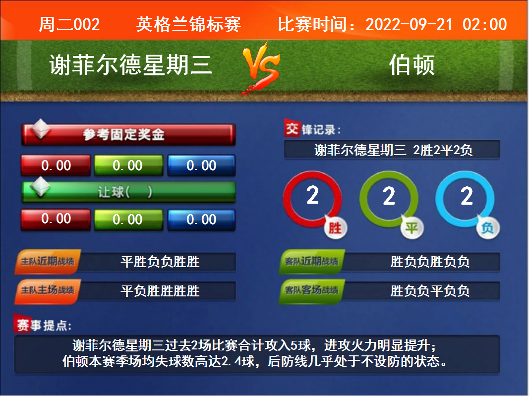 比賽時間:2022-09-21 02:00賽事提點:謝菲爾德星期三過去2場比賽合計攻入5球,進攻火力明顯提升;伯頓本賽季場均失球數(shù)高達2.4球,后防線幾乎處于不設防的狀態(tài)。