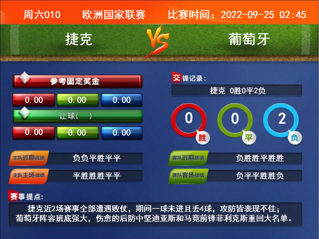 比賽時(shí)間:2022-09-25 02:45賽事提點(diǎn):捷克近2場(chǎng)賽事全部遭遇敗仗,期間一球未進(jìn)且丟4球,攻防皆表現(xiàn)不佳;葡萄牙陣容班底強(qiáng)大,傷愈的后防中堅(jiān)迪亞斯和馬競(jìng)前鋒菲利克斯重回大名單。