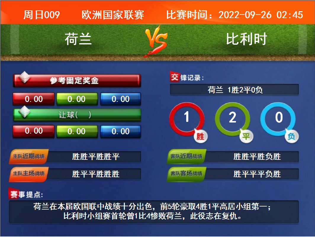 比賽時間:2022-09-26 02:45賽事提點:荷蘭在本屆歐國聯(lián)中戰(zhàn)績十分出色,前5輪豪取4勝1平高居小組第一;比利時小組賽首輪曾1比4慘敗荷蘭,此役志在復(fù)仇。
