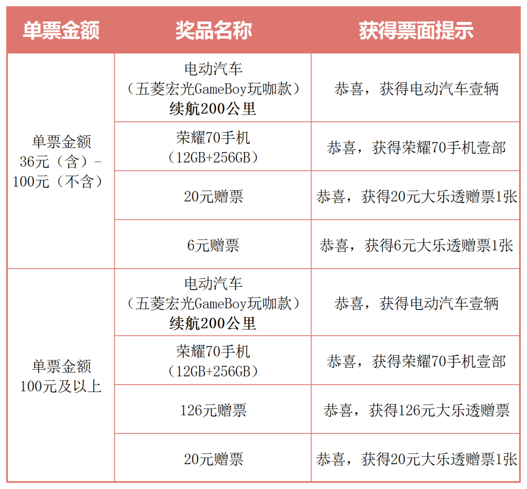 活動(dòng)期間,凡在河南省內(nèi),購買大樂透游戲單張金額達(dá)到36元及以上的彩票(多期票及多期票補(bǔ)打票不參與本次活動(dòng),以下同)即可參與活動(dòng)。有機(jī)會(huì)中得電動(dòng)汽車、榮耀70手機(jī)、126元贈(zèng)票、20元贈(zèng)票、6元贈(zèng)票等。