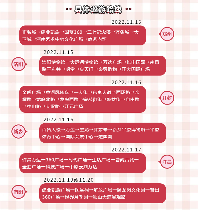 巡游活動將會陸續(xù)在開封、洛陽、新鄉(xiāng)、許昌、南陽五市展開,途經(jīng)各個地市商圈及市中心地帶,馬上參考我們下方的路線,追著我們的車隊一起跑起來吧!
