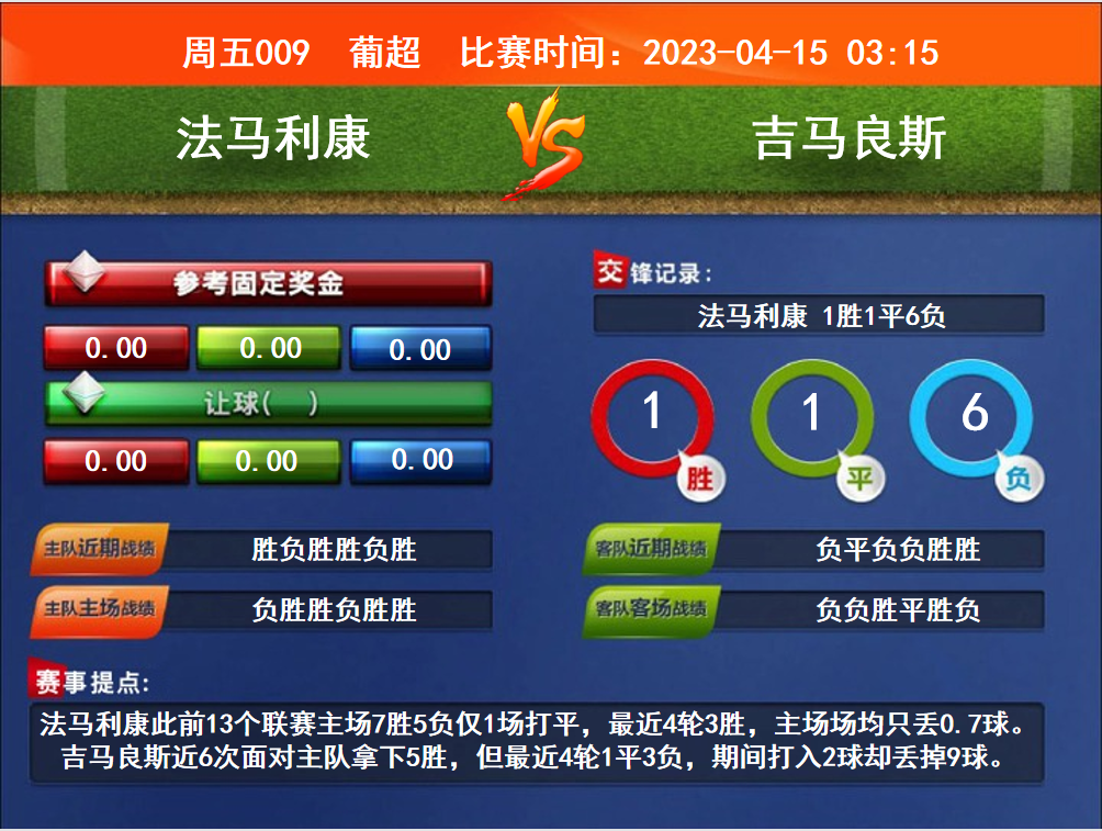 比賽時(shí)間:2023-04-15 03:15賽事提點(diǎn):法馬利康此前13個(gè)聯(lián)賽主場(chǎng)7勝5負(fù)僅1場(chǎng)打平,最近4輪3勝,主場(chǎng)場(chǎng)均只丟0.7球。吉馬良斯近6次面對(duì)主隊(duì)拿下5勝,但最近4輪1平3負(fù),期間打入2球卻丟掉9球。