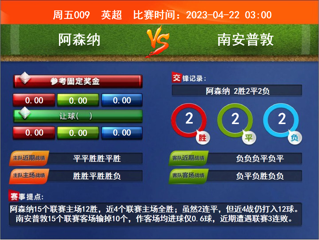 比賽時(shí)間:2023-04-22 03:00賽事提點(diǎn):阿森納15個(gè)聯(lián)賽主場(chǎng)12勝,近4個(gè)聯(lián)賽主場(chǎng)全勝;雖然2連平,但近4戰(zhàn)仍打入12球。南安普敦15個(gè)聯(lián)賽客場(chǎng)輸?shù)?0個(gè),作客場(chǎng)均進(jìn)球僅0.6球,近期遭遇聯(lián)賽3連敗。
