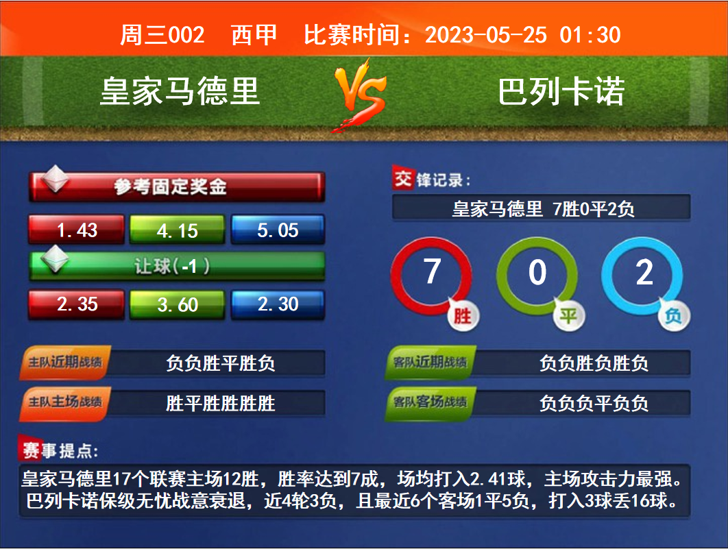 比賽時間:2023-05-25 01:30 賽事提點:皇家馬德里17個聯(lián)賽主場12勝,勝率達到7成,場均打入2.41球,主場攻擊力最強。巴列卡諾保級無憂戰(zhàn)意衰退,近4輪3負,且最近6個客場1平5負,打入3球丟16球。