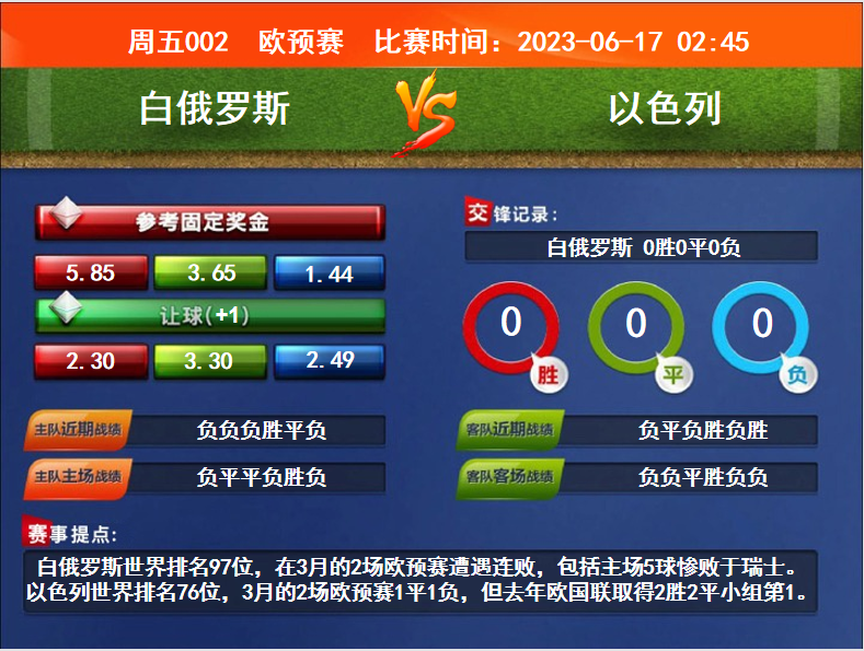 比賽時(shí)間:2023-06-17 02:45賽事提點(diǎn):白俄羅斯世界排名97位,在3月的2場(chǎng)歐預(yù)賽遭遇連敗,包括主場(chǎng)5球慘敗于瑞士。以色列世界排名76位,3月的2場(chǎng)歐預(yù)賽1平1負(fù),但去年歐國(guó)聯(lián)取得2勝2平小組第1。