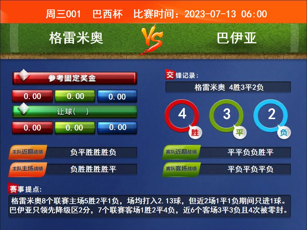 比賽時間:2023-07-13 06:00賽事提點:格雷米奧8個聯(lián)賽主場5勝2平1負,場均打入2.13球,但近2場1平1負期間只進1球。巴伊亞只領(lǐng)先降級區(qū)2分,7個聯(lián)賽客場1勝2平4負,近6個客場3平3負且4次被零封。