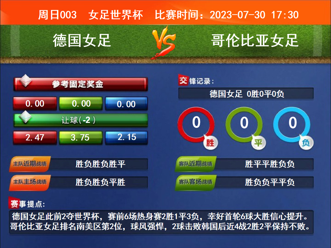 比賽時間:2023-07-30 17:30賽事提點:德國女足此前2奪世界杯,賽前6場熱身賽2勝1平3負(fù),幸好首輪6球大勝信心提升。哥倫比亞女足排名南美區(qū)第2位,球風(fēng)強(qiáng)悍,2球擊敗韓國后近4戰(zhàn)2勝2平保持不敗。
