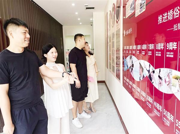 近年來,沈丘縣加大精神文明建設(shè)力度,通過舉辦文化大講堂等活動(dòng),在廣大群眾中形成“天價(jià)彩禮不可取,鋪張浪費(fèi)最可恥,陳規(guī)陋習(xí)危害大”的共識(shí),許多年輕人在耳濡目染中受到熏陶,新事新辦蔚然成風(fēng)。圖為8月29日,農(nóng)歷七月初七,結(jié)婚登記的新人在婚史展板前駐足。