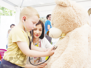 5月30日,在克羅地亞首都薩格勒布,一名男孩在“泰迪熊醫(yī)院”為他的毛絨玩具“聽診”。這一活動(dòng)的主要目的是消除孩子們對(duì)醫(yī)生和醫(yī)院的恐懼。