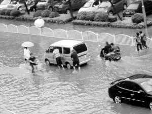 昨日,大雨后的周口市區(qū)七一東路一片汪洋,平常車(chē)載人,雨后人推車(chē)。